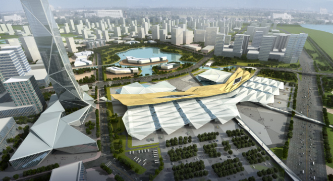 会展中心项目总建筑面积26万平方米。项目包括一个拥有国际水准的8.8万平方米的展览中心(9个展厅,4050个展位),一个5.6万平方米的会议大厅和12.5万平方米室外展场,另有3.7万平方米地下公共交通设施,以及餐饮、卫生间和其它服务设施。它们由一个5.1万平方米半围合的中央大厅贯穿连接,协调着各部分空间的功能关系。中央大厅设有三个出入口前厅,分布在会展中心的北面、东面和西面。北前厅为会展中心形象入口,与北侧主要公共活动广场相接。